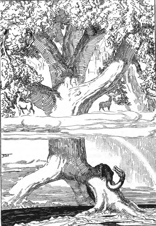 Around the base lives the dragon Nidhogg and several snakes, who all knaw at the roots. A eagles is found in the top branches and the squirrel Ratatoskr is running up and down to deliver insults between the eagle and dragon. 4 Stags, Dainn, Dvalinn, Duneyrr, and Durathror, are eating on the trees leaves.